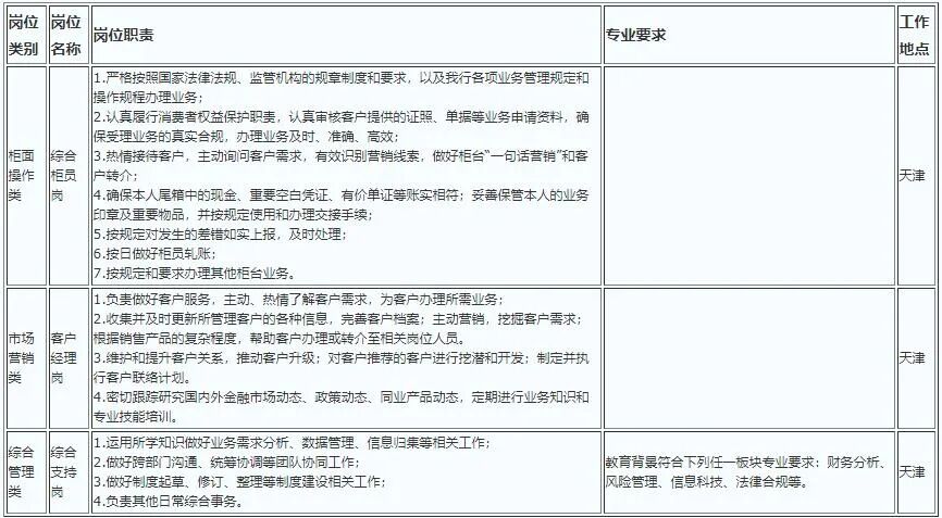 (一天津注册公司流程)综合营销岗。主要从事客户服务、柜面服务及业务营销等工作。新员工入职后,先在基层网点柜员等岗位进行培养锻炼,根据个人表现及工作需要,聘任至营业网点或其他机构相关岗位。